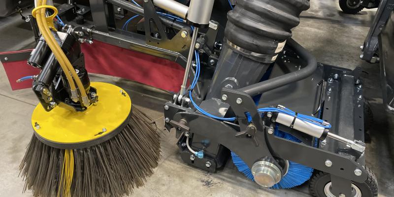 A wireless discharge pendant allows the operator to safely walk around the sweeper, tip the hopper and adjust the wide sweep brush.